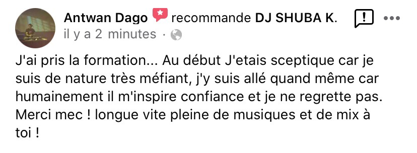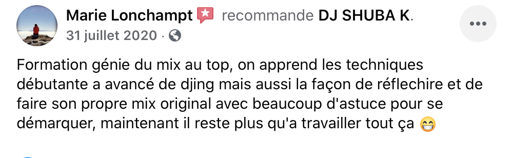 Je te montre des exemples avec tous les styles que l’on peut trouver dans la plupart des soirées. Ce que je te montre justement dans cette formation, c’est que tu peux être créatif et te réinventer peu importe ce que tu joues. Je te dévoile comment être maître de tes platines et à ne plus subir ni structure, ni genres, ni BPM.