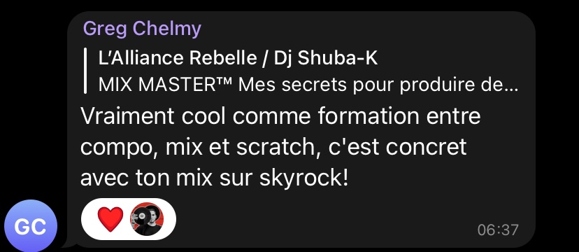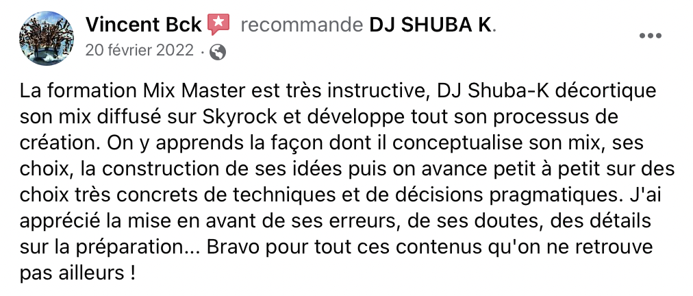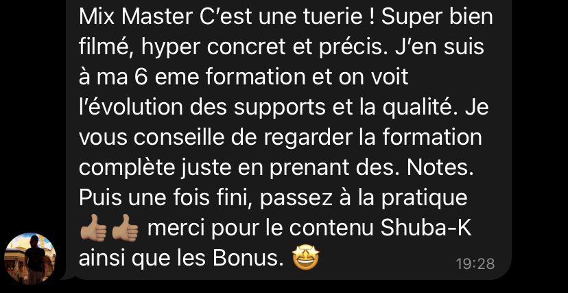 Dans ce module je te donne mes techniques de mémorisation pour que tu élimines 90% des risques de te tromper. C’est exactement ce que j’ai utilisé pour faire mon show à la radio ou même lorsque j’ai fait de la compétition en DMC (le genre d’endroit ou tu ne peux PAS te louper)